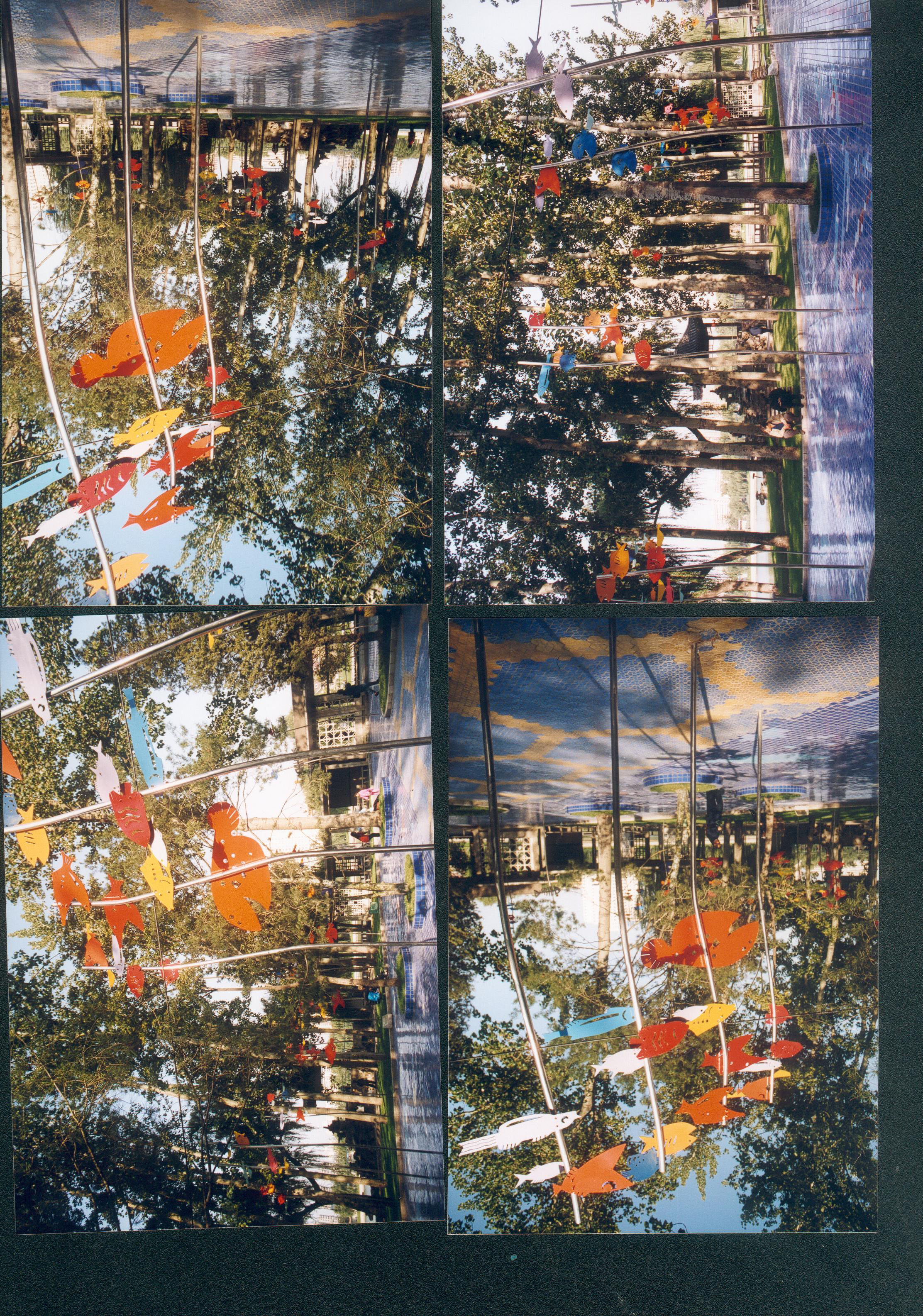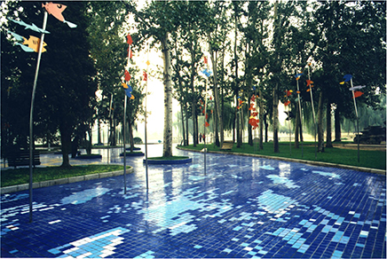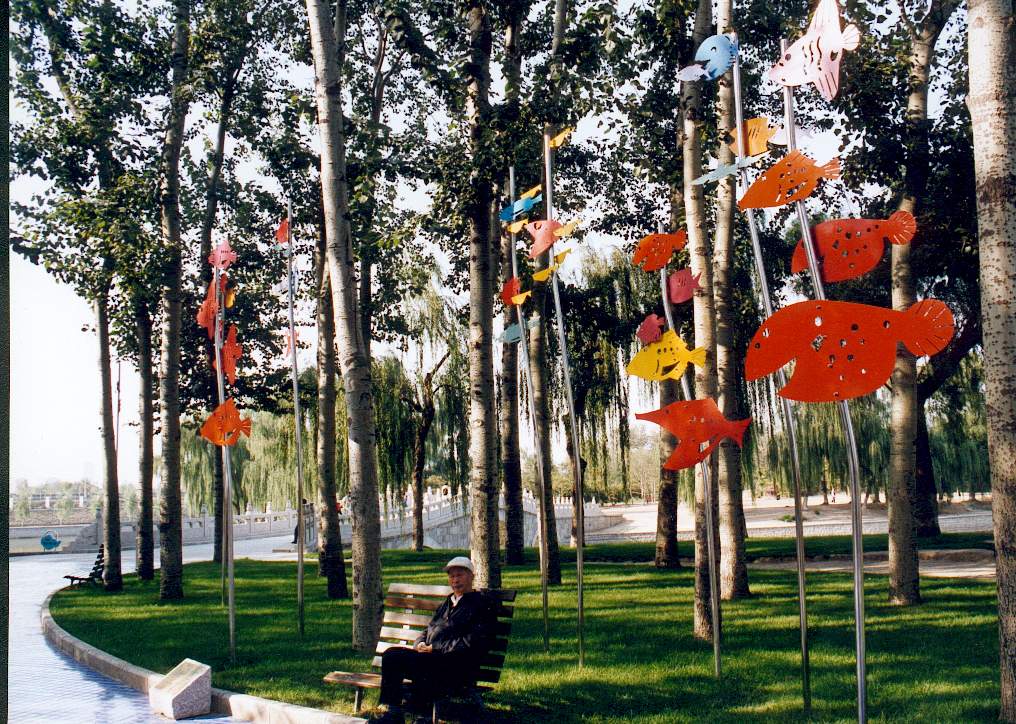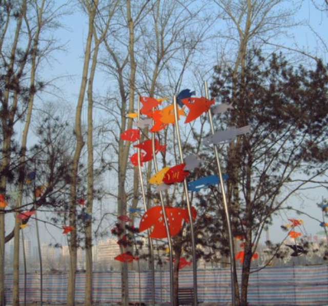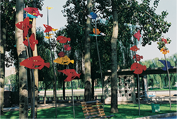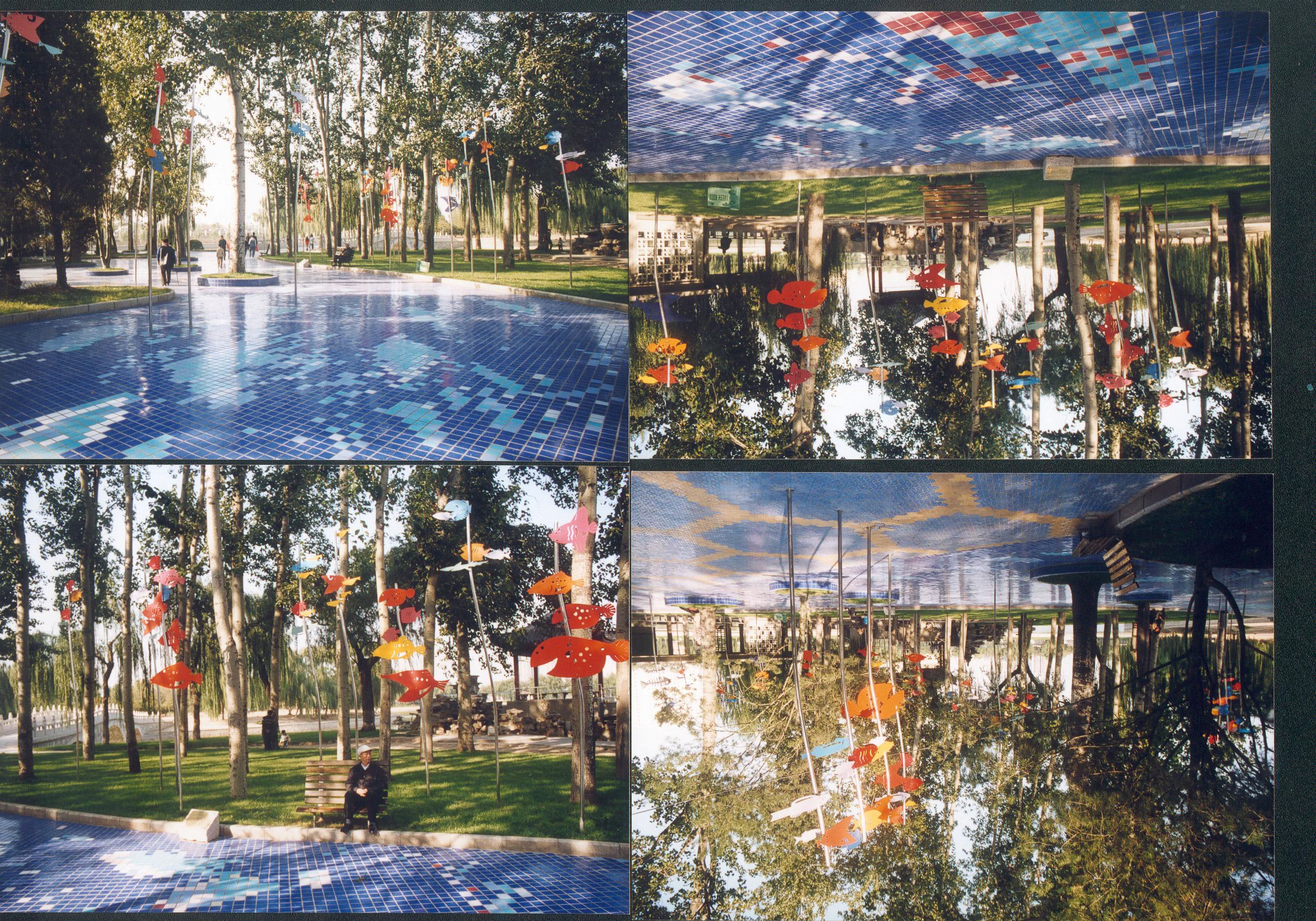 先看到现状树林,然后就有了水底观天的环境创作联想。。。。将手绘图案化的鱼挑高,大约最高点6米,地面铺装蓝色调瓷砖,有意制造出水底观天的环境场景。后来这片场地成为人群最爱聚集的地方,感觉比别处凉快。现在地面瓷砖被规范的六棱形蓝色透水砖取代。东西还在,曾经多年前维修过一次。