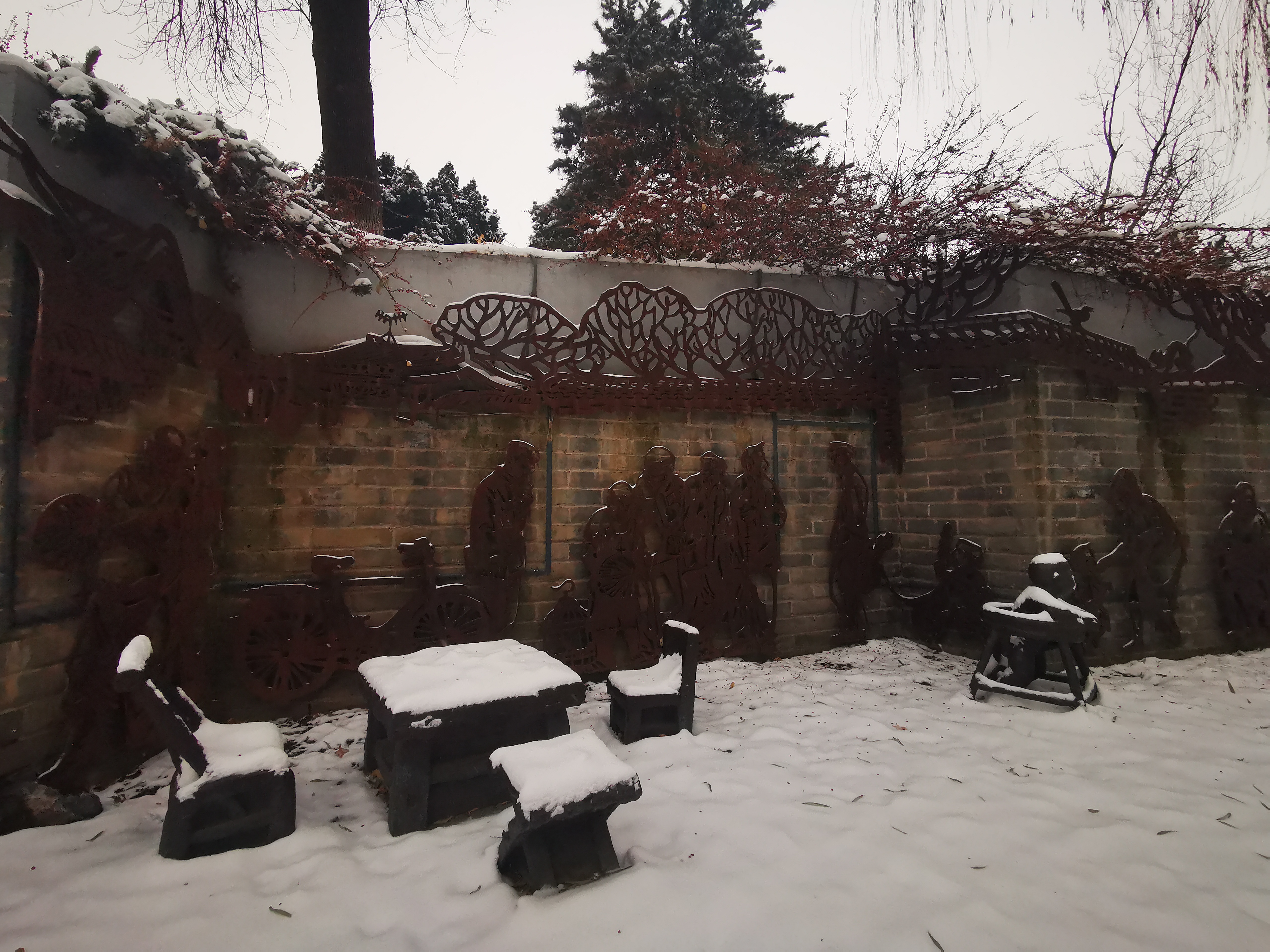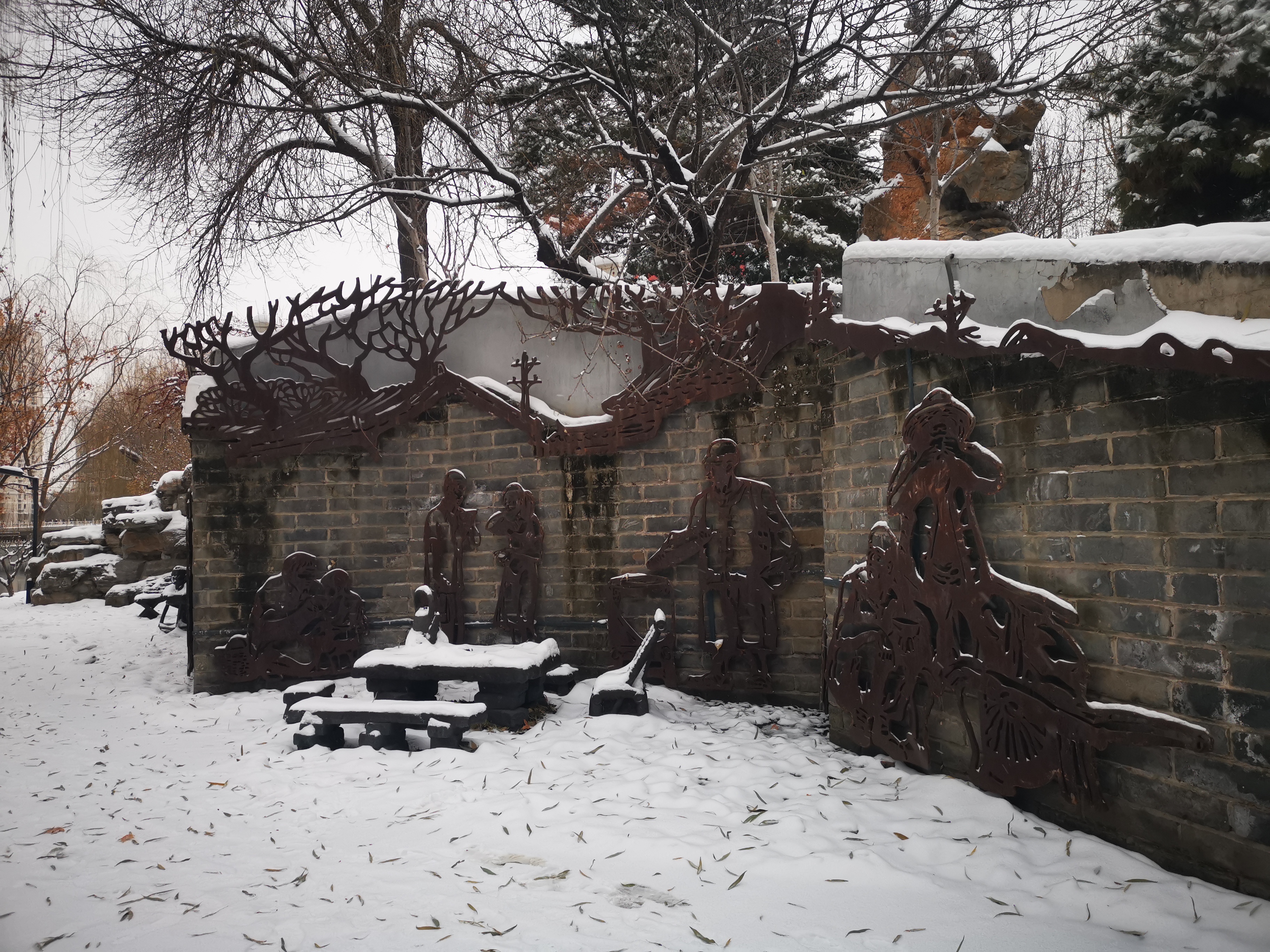 此作品分2部分,一部分是位于安定门立交桥西北侧河边,加油站后面,为以上图片所示。另一部分在安定门立交桥东北侧,加油站向东 园林内,展示了孩提时代的各种游戏。